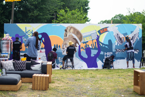 Songs that Shook is a live mural project I created at the 2019 Roots Picnic, born from the energy of five iconic hip hop songs: The Bridge, Ladies First, Rock Box, Alright, and Jesus Walks. Given just the songs as inspiration—with no direct images of the artists—I spent weeks designing a mural that captures the vibrant spirit and cultural impact of these tracks. On the day of the picnic, I painted the mural live, joined by a talented group of assistants and over 150 passionate participants from the crowd. The result is a dynamic, abstract celebration of rhythm, resilience, and the transformative power of music, turning the event into a collaborative fusion of art and hip hop culture.